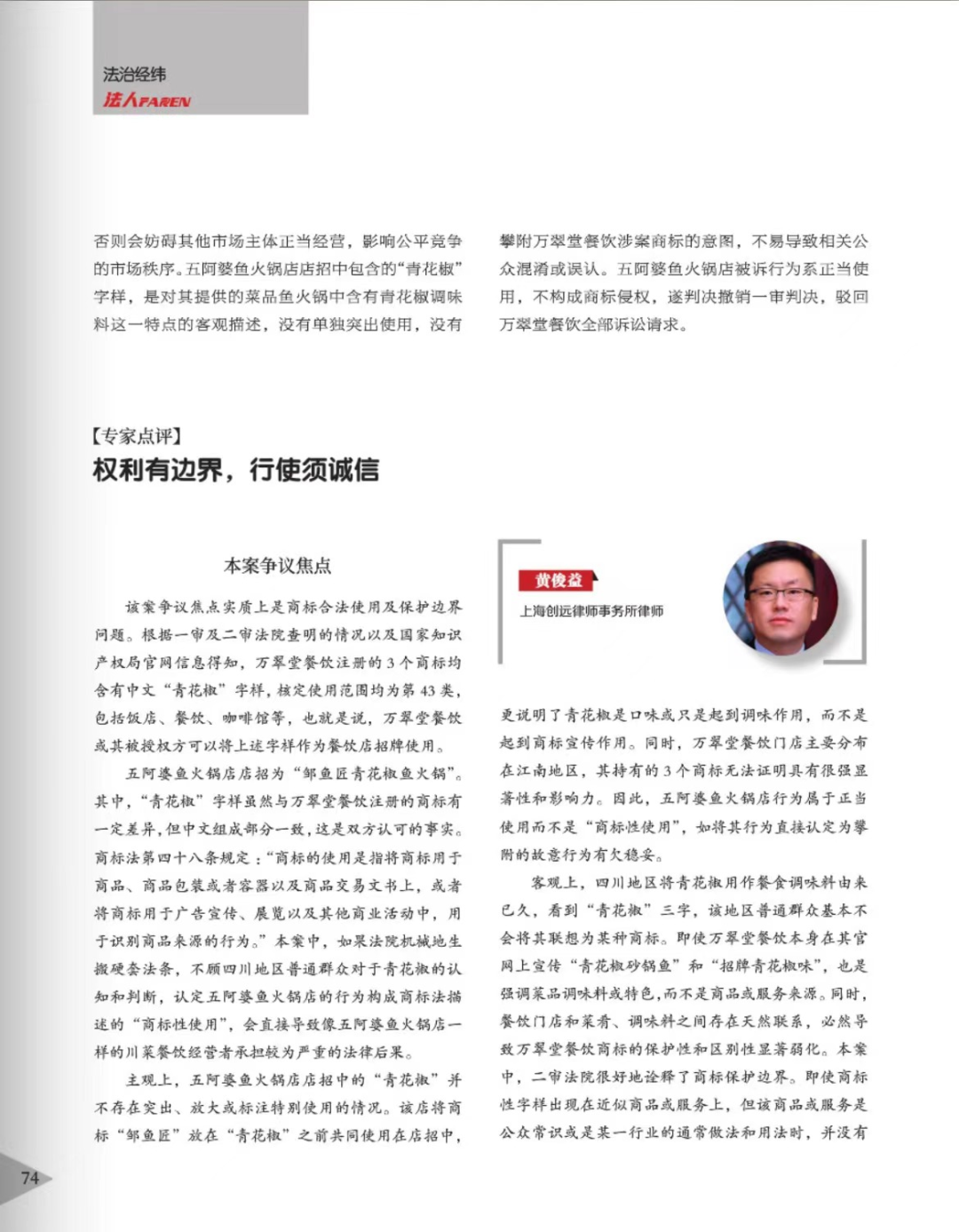 湖北辉知简讯 | 辉知队黄俊益律师应“法治日报”旗下杂志邀请,就“青花椒”案发表专家点评